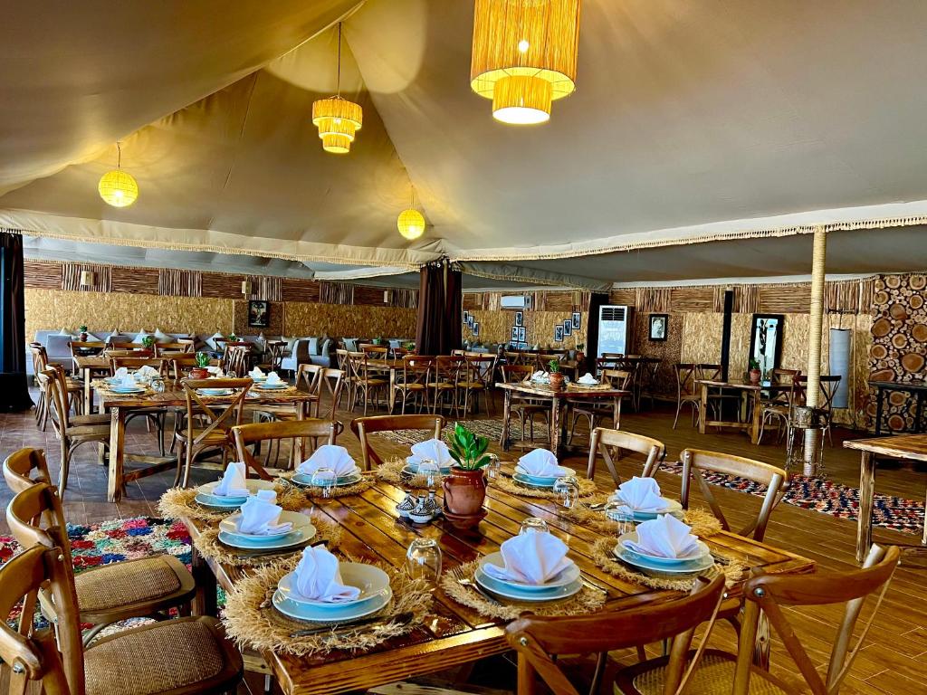 Je verblijft in een bedoeïenentent, compleet met comfortabele bedden en privévoorzieningen zoals een eigen badkamer met douche, wat je verblijf een extra vleugje luxe geeft in vergelijking met standaard basiskampen. ‘s Avonds kun je genieten van een kampvuur waar je gezellig omheen zit. In de gezamenlijke eetruimte wordt er iedere avond voor de gasten het eten geserveerd. In de warmere maanden proberen we een kamp te selecteren met een zwembad, afhankelijk van de beschikbaarheid.
